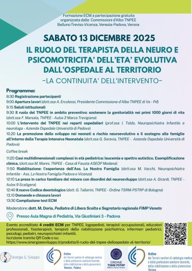 La Commissione d’Albo dei Terapisti della Neuro e Psicomotricità dell’Età Evolutiva (TNPEE) delle province di BL-TV-VI, in collaborazione con le CdA dei TNPEE di Padova-Venezia e Verona, comunica l’evento di sabato 13 dicembre 2025 dal titolo “Il ruolo del TNPEE dall’ospedale al territorio”.